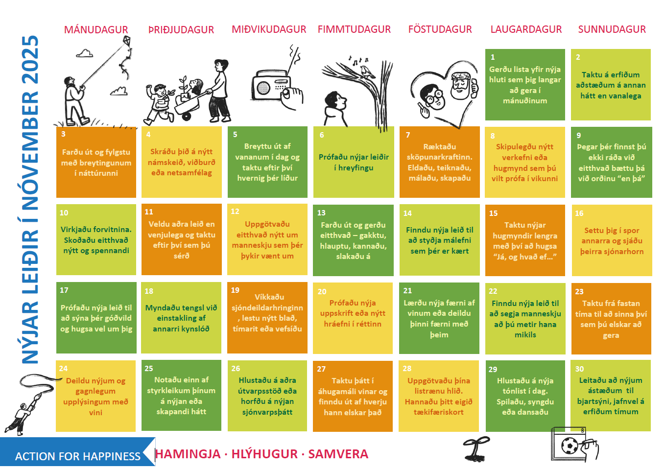 Hér má sjá virknidagatal með jákvæðum tillögum fyrir hvern dag mánaðarins frá Action for happiness. Tillögurnar eru í anda þess sem rannsóknir hafa sýnt að geti hjálpað fólki að lifa hamingjuríkara lífi svo sem að gefa af sér, tengjast öðrum, finna tilgang, leika sér og njóta augnabliksins. Flestar þeirra eru bráðskemmtilegar og auðveldar í framkvæmd.